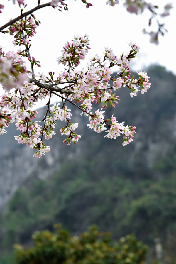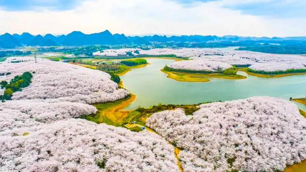 As temperatures rise, late-blooming cherry blossoms reach their peak at Jiaxiu Pavilion scenic area in Nanming district, Guiyang, capital of Southwest China's Guizhou province.